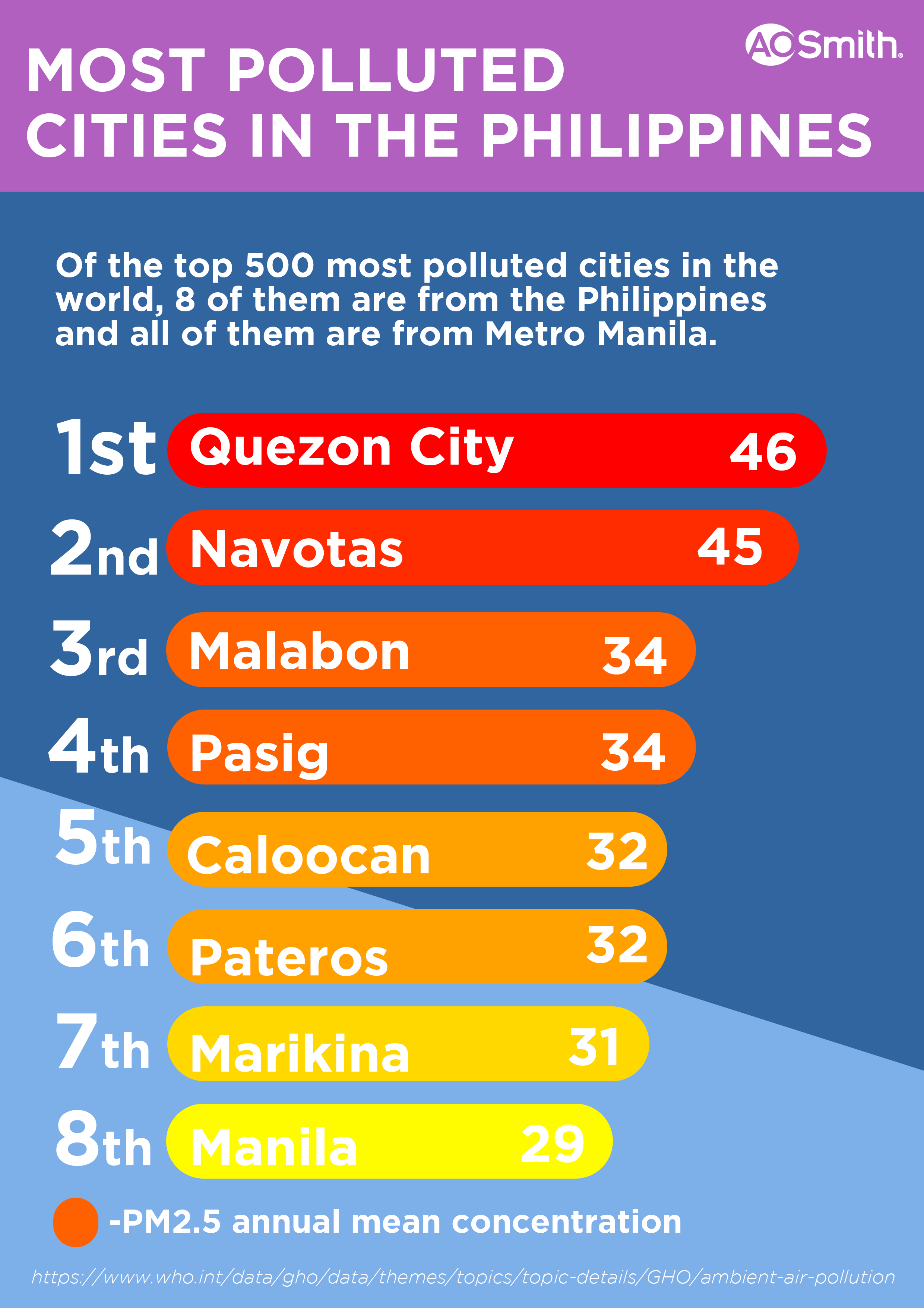 At the time of this writing Makati, Pasig, and Quezon City are the top 3 cities with the most air pollution in NCR (3) while Balanga in Central Luzon has the most air pollution nationwide according to the World Air Quality Index. In 2020 the Philippines also ranked fifth, just below Thailand, among Southeast Asian nations with the poorest air quality.